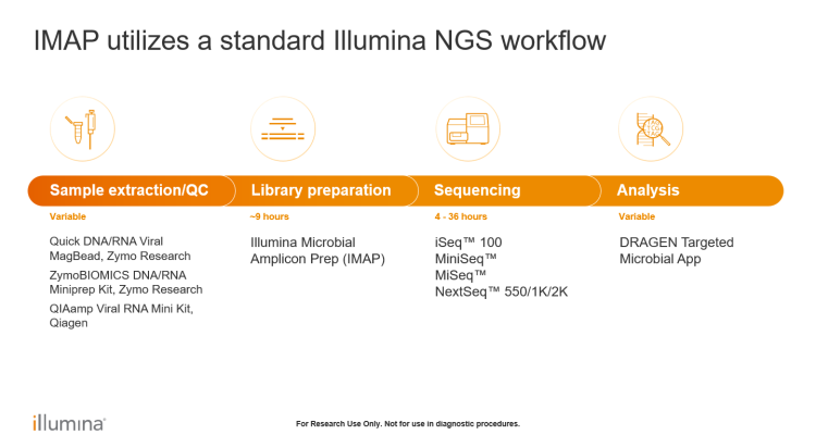 Illumina Microbial Amplicon Prep (iMAP) is an amplicon-based library preparation kit built on the same chemistry as COVIDSeq. Library preparation is fast and simple, with libraries compatible with nearly all Illumina sequencing systems. It can be used for various infectious disease, public health surveillance, and microbial research applications, including viral whole-genome sequencing, antimicrobial resistance marker analysis, bacterial and fungal identification, and more.